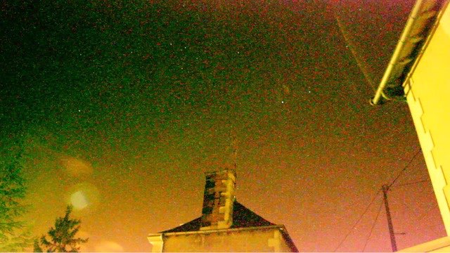 Ici, le ciel rose correspond à la pollution lumineuse ambiante. Le grain vert, à la surchauffe du capteur.