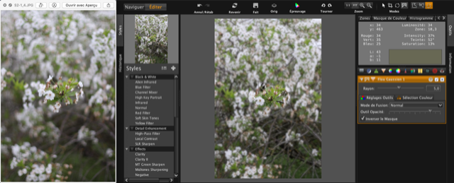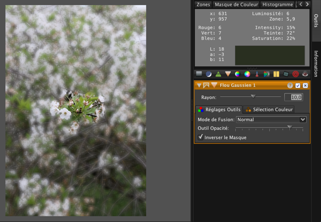 Manipulation très facile avec « LightZone », je suis partie de la photo à F/22 en la comparant à la F/1,4.