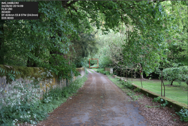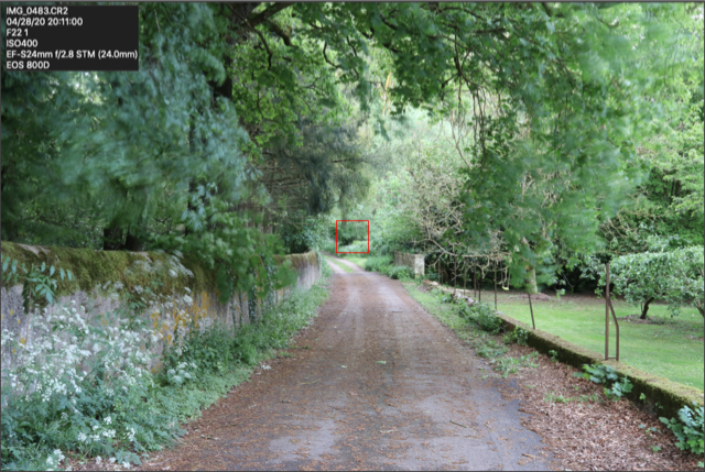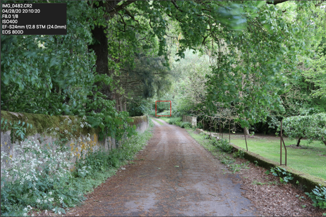 Voici les conditions de prises de vues : il y avait beaucoup de vent, donc ne pas tenir compte des branches des arbres en hauteurs qui pourraient être floues, se focaliser sur l’allée et le point le plus loin.