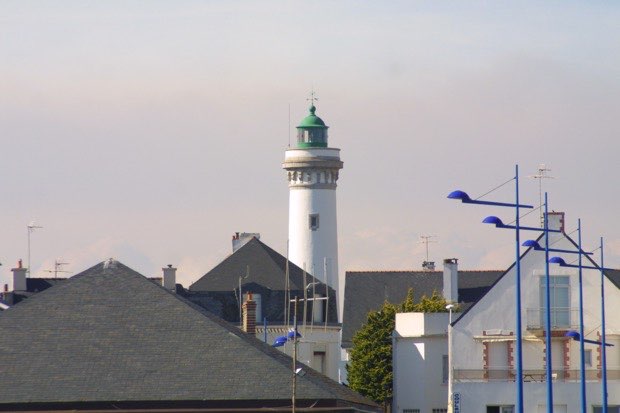 Quiberon (France) : le phare ressort au-dessus des maisons.