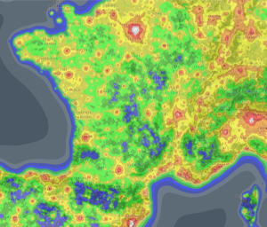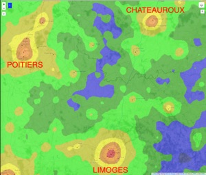 L’idéal en France : le Plateau de Millevaches (le petit triangle gris, en bas, à droite de Limoges) ...